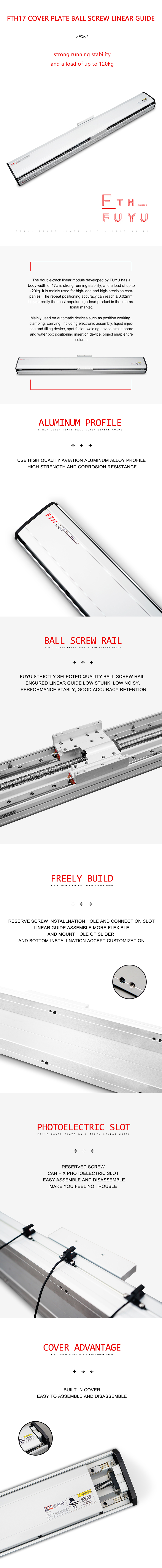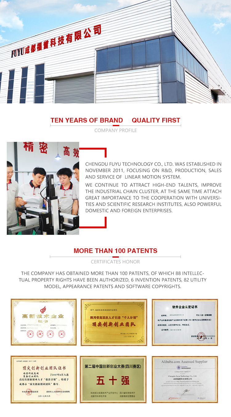 FUYU Technology ist ein Hersteller intelligenter Produkte für lineare Bewegungssysteme.Zu unseren Hauptprodukten gehören Kugelumlaufspindel-Linearmodule, riemengetriebene Linearführungsschienen, elektrische Stellantriebe, mehrachsige Positionierungstische und Bewegungssteuerungen für kartesische Roboter. Als nationales High-Tech-Unternehmen wurden 82 geistige Eigentumsrechte genehmigt, darunter 6 Erfindungspatente. Gebrauchsmuster, Erscheinungspatente und 76 Software-Urheberrechte.Wir sind nach CE, FCC, RoHS, IP65, TÜV und ISO9001 zertifiziert. Das mehrachsige Positionierungssystem kann aus mehreren Modulen bestehen, Hubbereich 50 mm–4000 mm, Positionsgenauigkeit 0,02 mm–0,2 mm und Tragfähigkeit 3 kg–180 kg.Sie werden häufig für medizinische Geräte, Automatisierungsproduktlinien, die Elektronikindustrie usw. verwendet. Als Industriefabrik akzeptieren wir auch OEM.Sobald Sie das Maschinendesign vorgelegt haben, werden sich unsere Ingenieure innerhalb von 48 Stunden mit Ihnen in Verbindung setzen, um die beste Lösung für das Linearbewegungssystem vorzuschlagen.