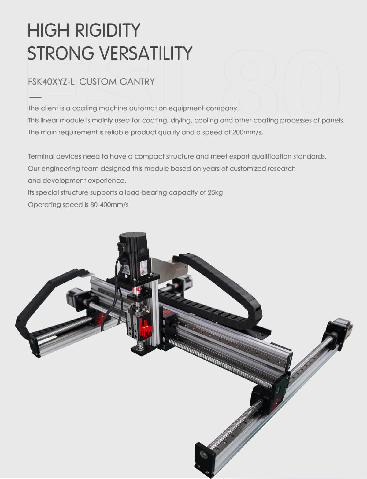 Asiakas on pinnoituskoneiden automaatiolaitteita valmistava yritys. Tätä lineaarimoduulia käytetään pääasiassa paneelien pinnoitukseen, kuivaukseen, jäähdytykseen ja muihin pinnoitusprosesseihin. Tärkein vaatimus on luotettava tuotteen laatu ja 20 mm/s nopeus. Päätelaitteiden on oltava kompakteja ja täytettävä vientikelpoisuusstandardit. Suunnittelutiimimme suunnitteli tämän moduulin vuosien räätälöidyn tutkimus- ja kehityskokemuksen pohjalta. Sen erityinen rakenne tukee 25 kg:n kuormankantokykyä ja käyttönopeus on 80-400 mm/s.