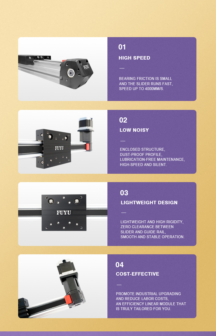 Estrutura fechada, perfil à prova de poeira, manutenção sem lubrificação, alta velocidade e silencioso.