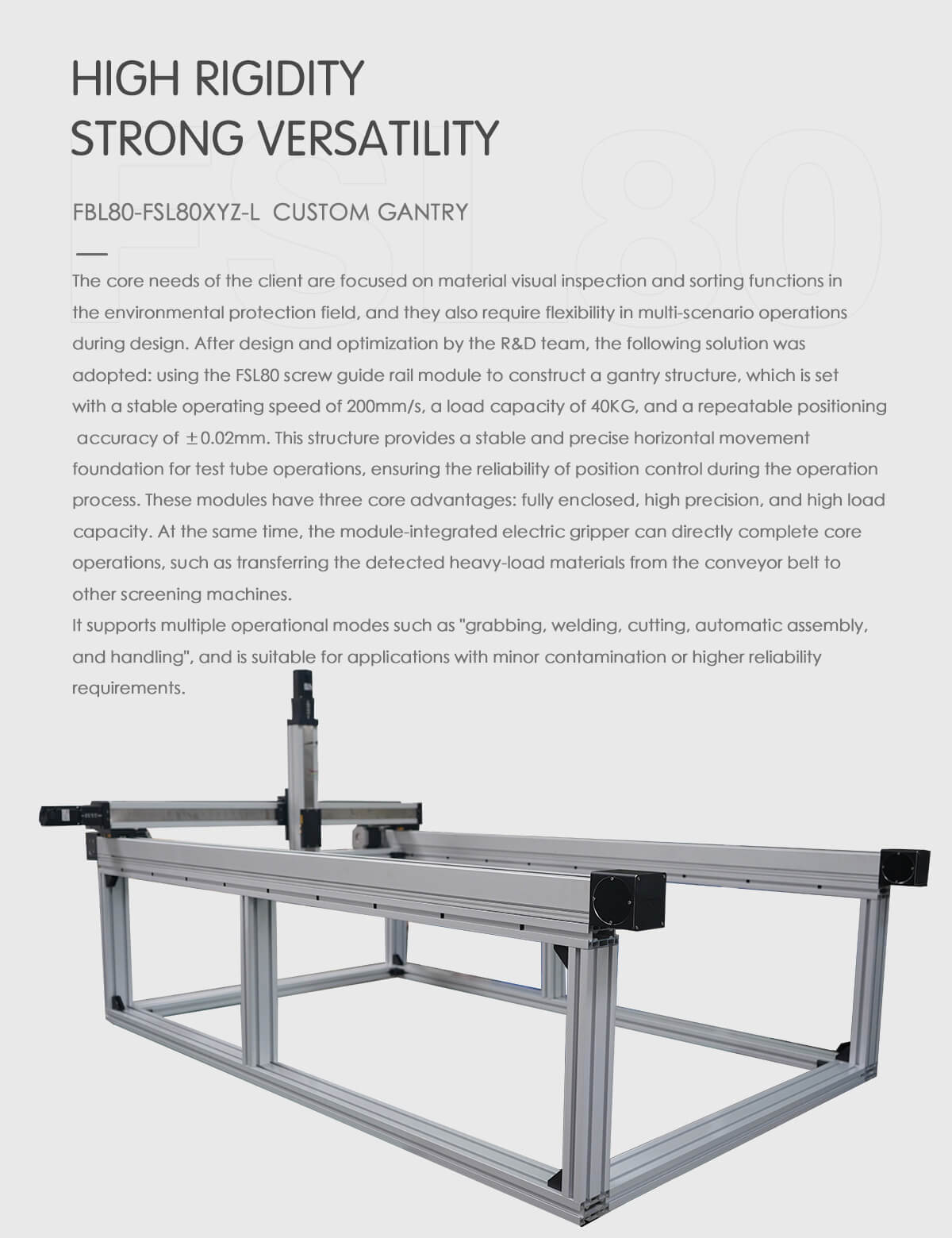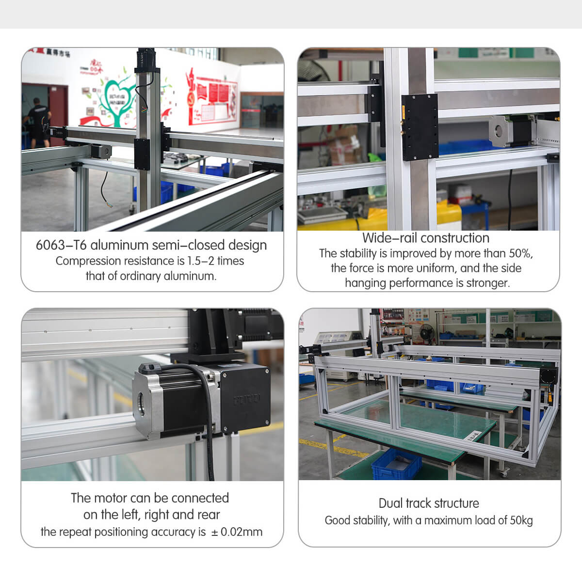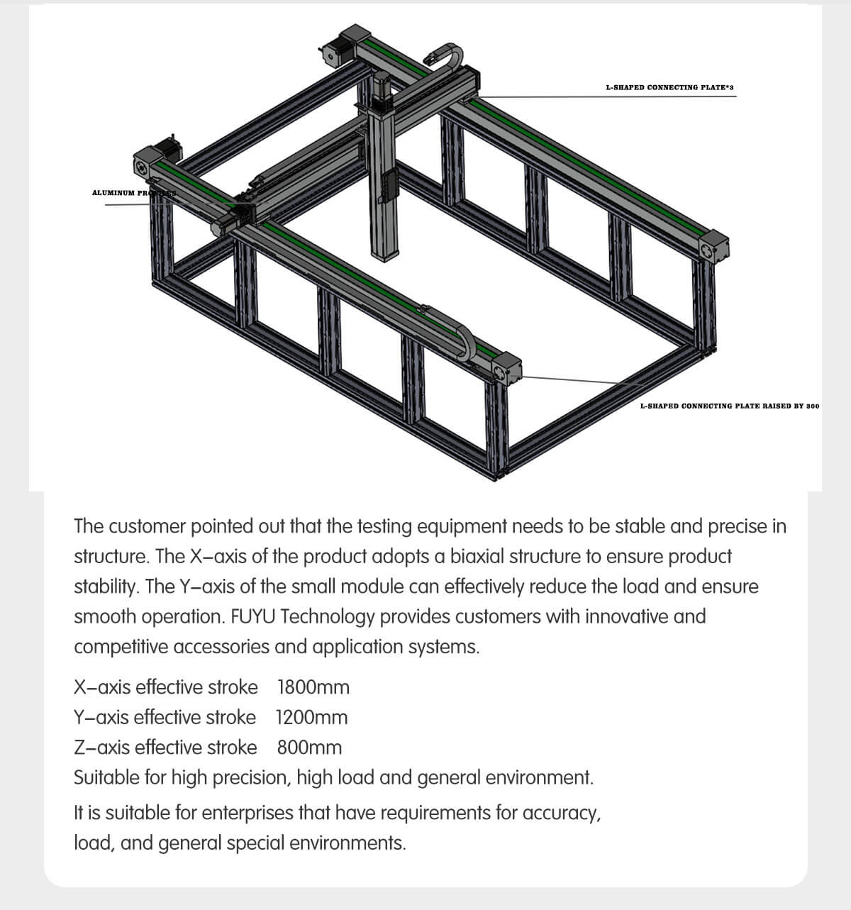 FUYU — производитель интеллектуальных продуктов для систем линейного перемещения. Наша основная продукция включает в себя линейный модуль с шарико-винтовой передачей, линейную направляющую с ременным приводом, электропривод, позиционирующий стол и контроллер движения для декартового робота. Как национальное высокотехнологичное предприятие, мы зарегистрировали 82 права интеллектуальной собственности, включая 6 патентов на изобретения, полезные модели, патенты на внешний вид и 76 авторских прав на программное обеспечение. Мы сертифицированы CE, FCC, RoHS, TUV и ISO9001. Многоосевая система позиционирования может состоять из нескольких модулей, диапазон хода 50–12000 мм, точность позиционирования 0,02–0,2 мм и грузоподъемность 3–180 кг. Они широко используются в медицинском оборудовании, на линиях автоматизации, в электронной промышленности и т. д. Как промышленный завод, мы также принимаем OEM-производителей. После того, как вы предоставите проект машины, наши инженеры свяжутся с вами в течение 48 часов, чтобы предложить лучшее решение для системы линейного перемещения.